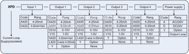 XP Series Signal Isolator(Current Loop Supply) code table: