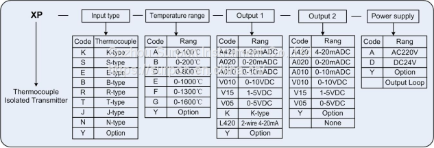 Example 1 input: K-type thermocouple, 0~800℃, output: one channel 4-20mA, power supply: 24VDC
