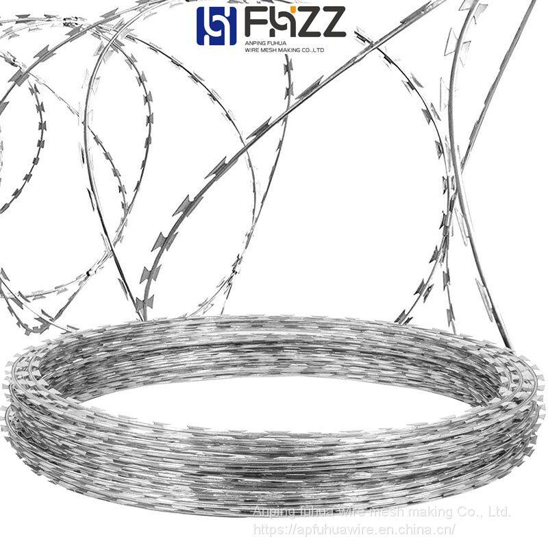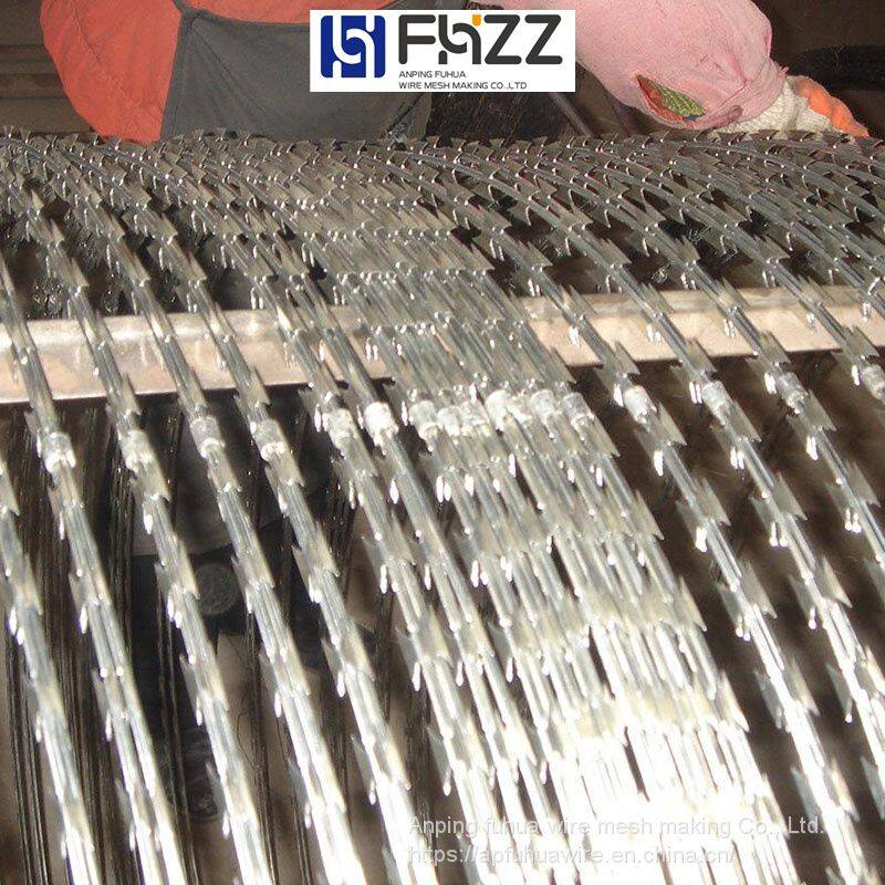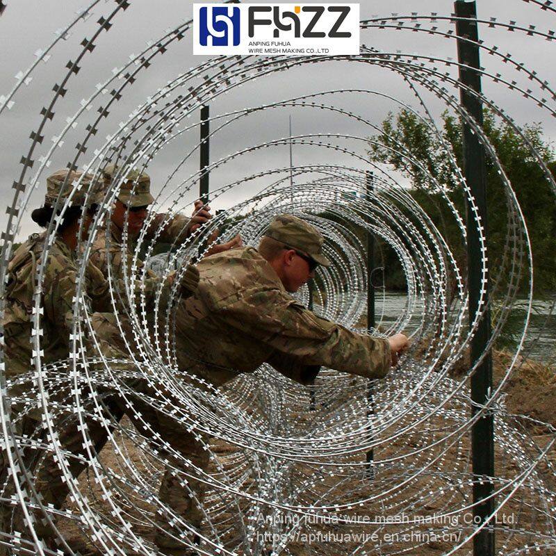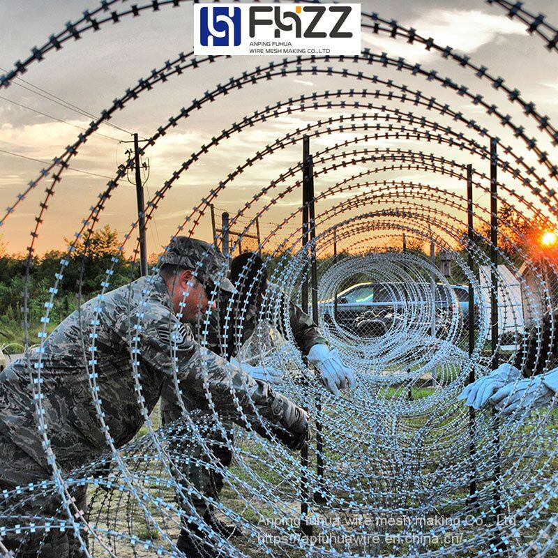 Border line with razor barbed wire fence generally uses large diameter knife circle of double spiral razor barbed wire, such as 700mm-980mm circle warp. Can be multi-circle stacking arrangement, or small and large circle double circle stacking, in order to improve the ability to prevent overturning. Knife barbed model selection principles are high hardness, knife sharp, knife spacing should be densely arranged, anti-corrosion treatment process should be able to adapt to the local geographical environment and meet the expected service life requirements. Double spiral razor barbed wire fence, through the appropriate number of snaps will be adjacent to the knife circle in the circumferential length of the direction of equal intervals fixed, the material arrives at the construction site in accordance with the design of the installation spacing stretch to form an accordion-type spiral cross mesh cage shape. The larger the circle is designed, the more snaps should be appropriate to increase the number of snaps.