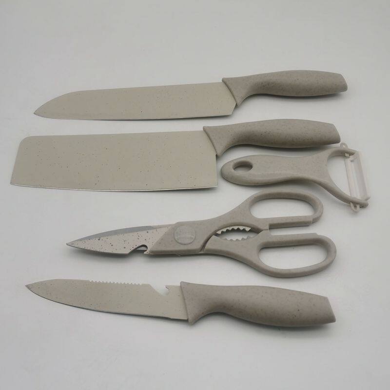 Product name | 5 pcs cream wheat straw kitchen knife set with box package Cleaver Butcher knife *1 Chef knife *1 Utility knife *1 Scissor *1 Ceramic Peeler *1 | |