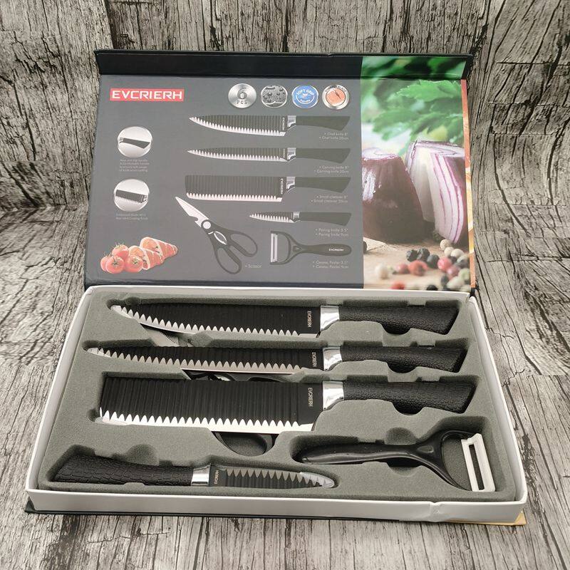 The 6 pieces knife set Includes: 8’’ chef knife/20cm chef knife, 8’’ Carving knife/20cm Carving knife, 8’’ small cleaver/20cm small cleaver, 3.5’’ Paring knife/9cm Paring knife, 3.5’’ Ceramic Peeler/9cm Ceramic Peeler, and Scissors.