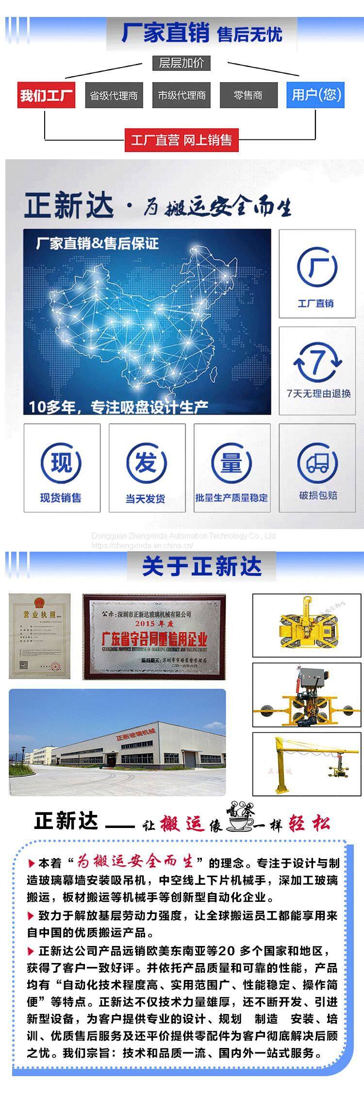 The handling of the vacuum device of Zhengxinda glass suction crane is very fast, so the cost saving lies in the speed. Our vacuum handling system does not leave traces on the product, so it can handle materials that need to be handled carefully.