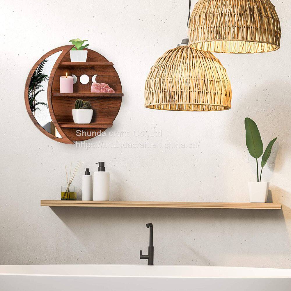 Wall Mounted Round Moon Mirror With Shelf Hanging Storage Display Glass Mirror Wall Decor for BathRoom