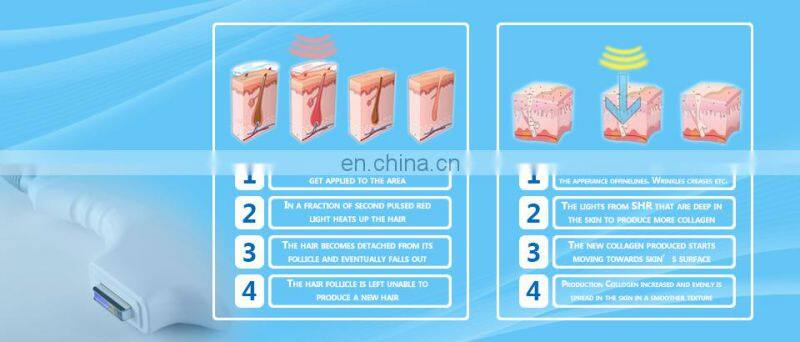 This machine base on that the Intense pulse light can penetrate into deep skin, and destroy the hair follicle. So it will do a good job for the hair removal. And use the different wavelength. Which can achieve the purpose for skin rejuvenation, such as the Acne removal, Vascular removal.