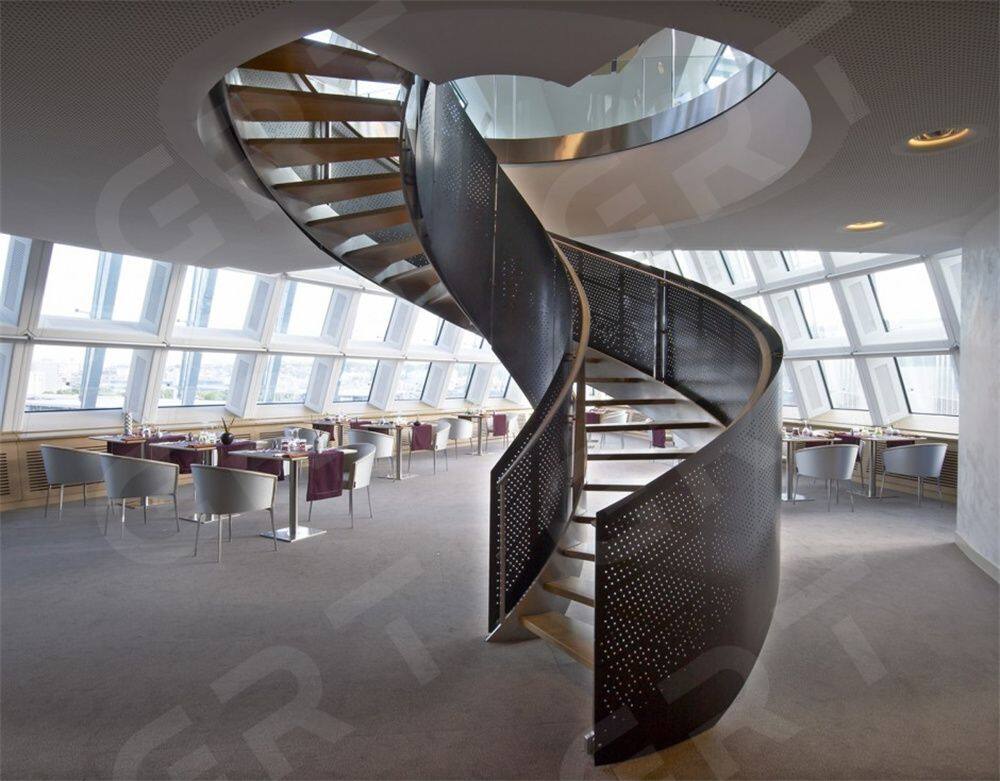 Modern Art Design Arc / Curved Staircase With Perforated Railing Steel Balustrade