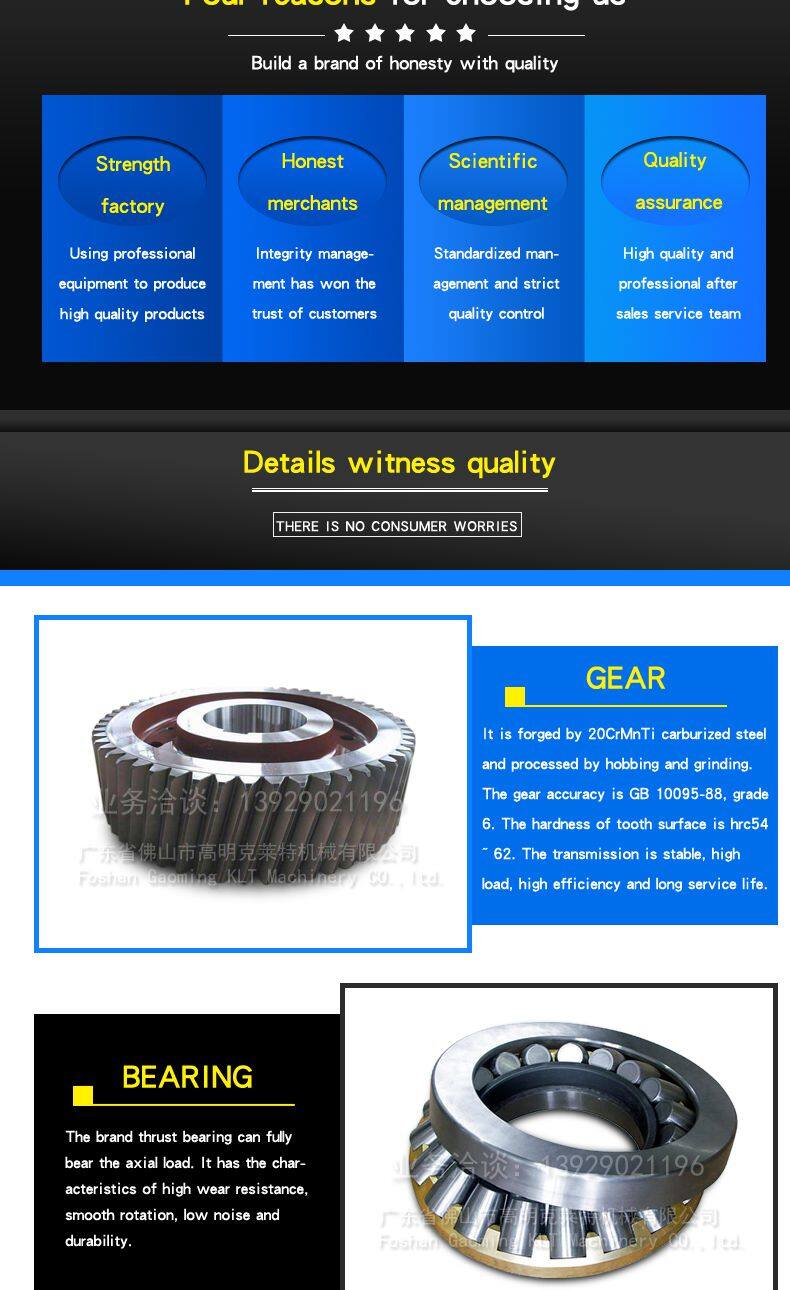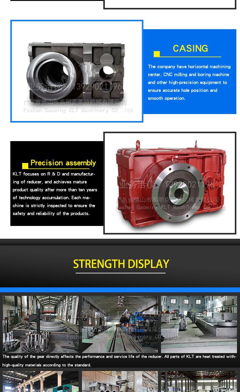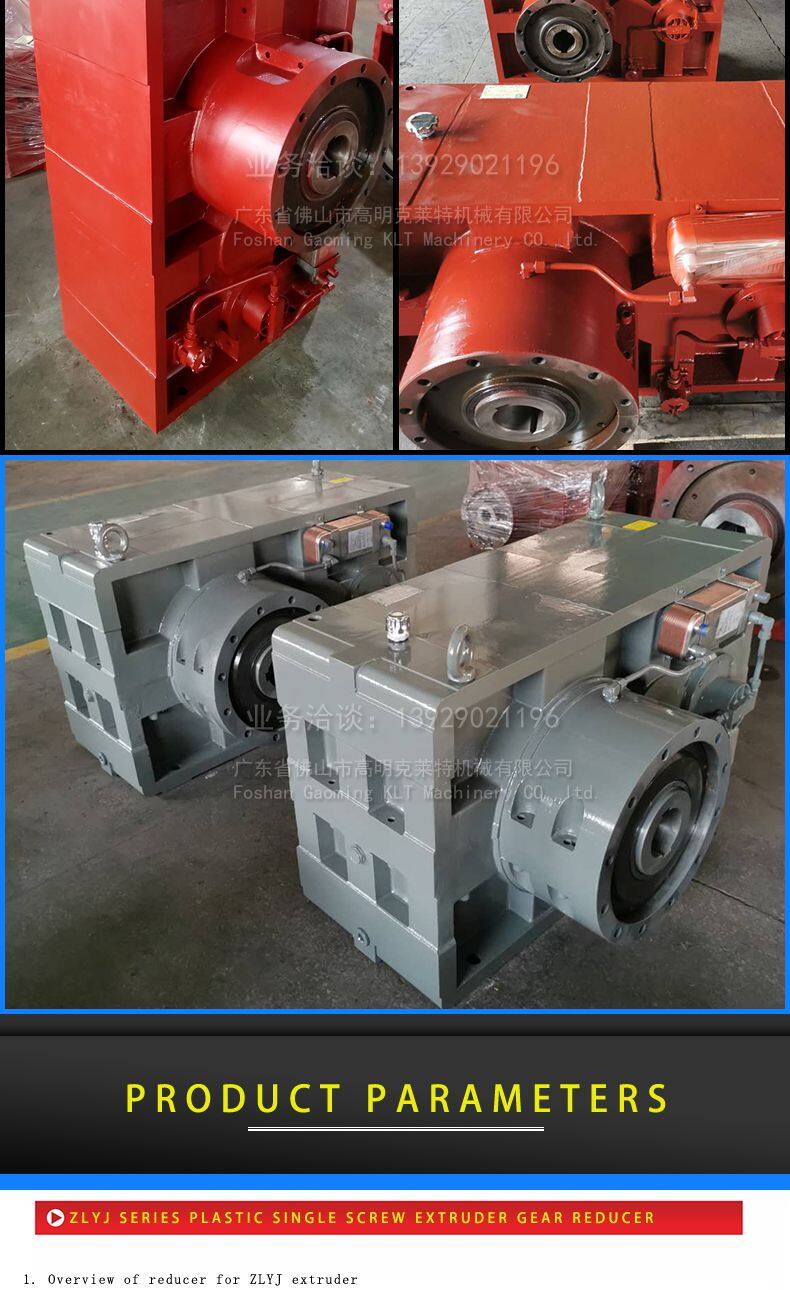 The reducer for ZLYJ extruder is a gear transmission device with high precision hard tooth surface and thrust pack designed for plastic and rubber screw extruders.The product design refers to the technical specifications specified in cylindrical gear reducer (JB / T 8853-2001).Its characteristics have many similarities with ZLY cylindrical gear reducer , gear and shaft parts are made of high strength alloy steel.The gear is processed by carburizing, quenching and grinding.The accuracy of gear is grade 6 in GB 10095-88.Hardness of tooth surface HTC58 ~ 62.The front section of the hollow output shaft is equipped with a large size thrust bearing to bear the axial thrust when the screw is working.The whole machine has the characteristics of small volume, high bearing capacity, stable transmission, low noise and high efficiency.