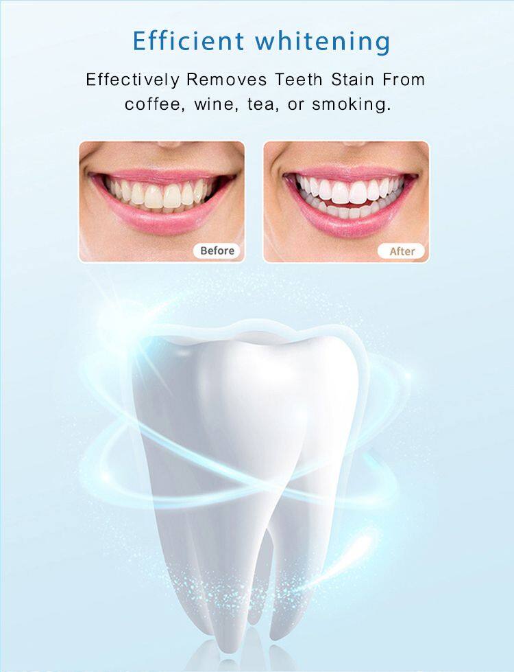 The peroxide formula contacted with teeth stains inside the enamel and react to dissolve the stains instantly in 30 minutes, create a bright smile after 14 days whitening treatment.