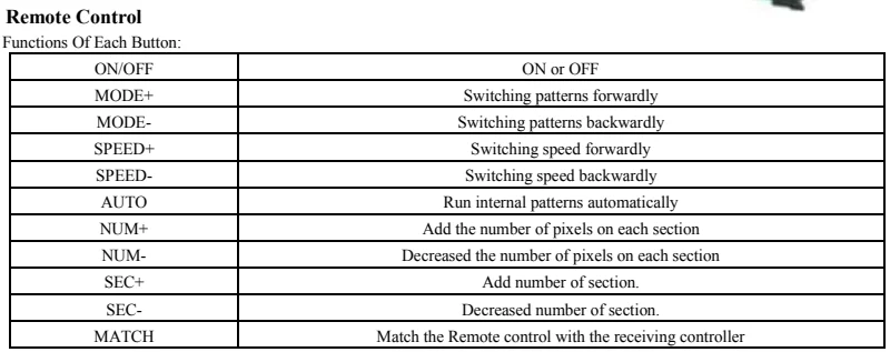 1:Optional DC5V, 12V voltage input. 2:Support single-line or dual-line LED driver IC. 3:Up to 2450 pixels can be controlled. 4:Comes with 125 pattern effects. 5:Support the remote control and the receiving board pairing function, the world's only ID number. 6:The remote control distance can reach more than 15M. 7.The power supply has anti-reverse connection function. 8:Package dimensions:115*80*27mm. 9:Net Weight:50g. 10:Packing sise:410*310*150mm/100PCS,