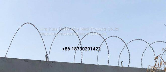 The Spiral Razor Wire is connected by the wire connecting clamp and the longitudinal tensile reinforcement fixed on the bracket. Longitudinal tensile reinforcement is used to connect with stents Φ 2.5 mm cold drawn tight fixed after galvanized steel wire round 2. The support is arranged at the column and mid-span of 3m protective fence, where the span is arranged into the upper part of the column, and the support and protective fence are connected by bracket hoop, for the protective fence with metal mesh already installed.Stinging cage directly use cold drawn Φ 2.5 mm galvanized steel wire or stinging connection card buckle fixed on the metal mesh horizontal slice and wire.