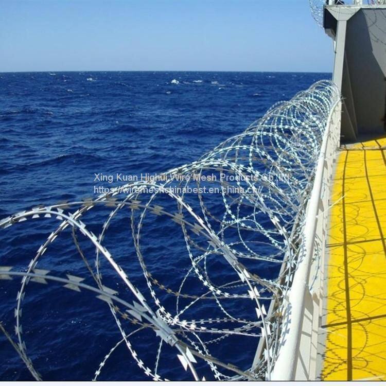 For ship security , we always install razor balde wire along the edge of the ship . we suggest use is stainless steel material along sea side for anti rust ,anti corrode , but the cost is a little high , so we can choose galvanized material with low cost ( heavy zinc 100um-270um) , (common hot dipped galvanized -30um-50um) ,we dont suggest to choose electric glavanized which is used on wet environment .
