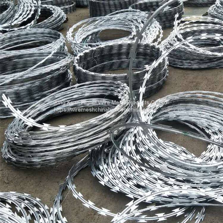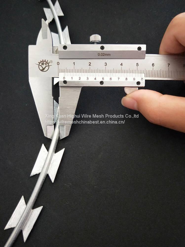 Blade barbed wire is by the wide hot dip galvanized steel sheet material after professional stamping machine into the blade shape of strip steel, again by another machine after stamping plate coated steel wire, to make them more hard and more easy to install is not easy to deformation, spiraling again after the customer requirement to decide whether to take card, card buckle is connect the two adjacent wire, make its after open the double helix structure, make the blade more intensive and more safe, with no clips that have a single spiral, both of which have very good protection effect, is a good choice.