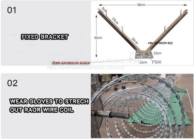 When the razor barbed wire roll is installed on the railway protective fence, the razor barbed wire roll and the protective fence are connected by longitudinal bracing and bracket connection.