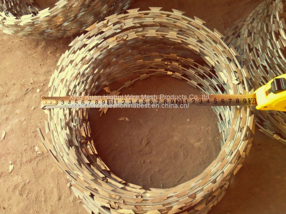 Barbed tape Razor Wire can be installed to achieve the result of frightening and stopping to the aggressive perimeter intruders, with piecing and cutting razor blades mounted at the top of the wall, also the special designs making climbing and touching extremely difficult.Razor barbed wire or barbed tape generally used because the sharp blade is not easy to touch, it can for residents of the wall protection, can also be used to rail off the place, in terms of anti-theft effect the razor wire is better than ordinary barbed wire, and the price is not high, so razor rope is more and more widely used.