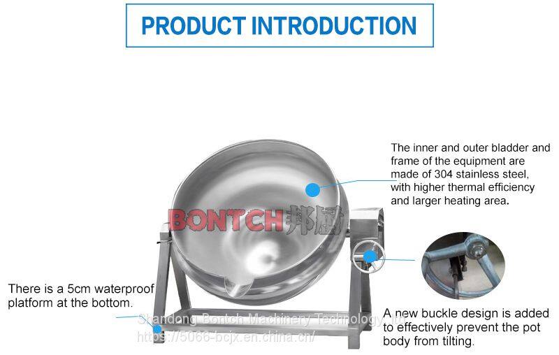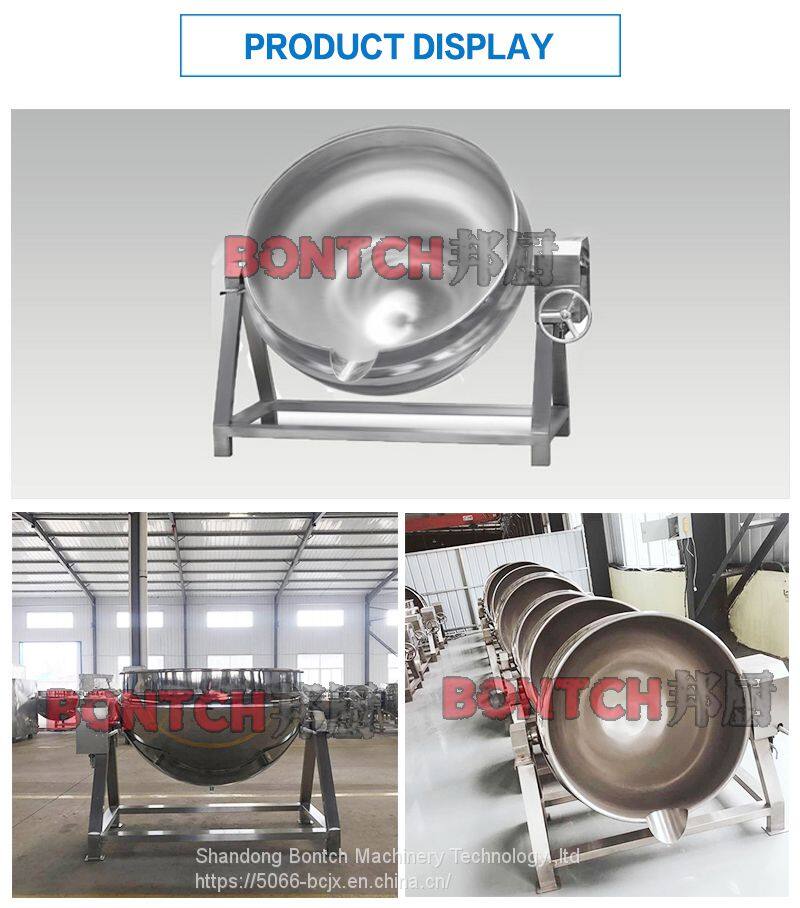 Also known as steam pot, cooking pot, sandwich steam pot. It usually consists of a pot body and legs. The pot body is a double-layer structure composed of an inner and outer spherical pot body, and the middle layer is heated by steam. There are fixed, tiltable, stirring and other styles. The jacketed pot has the characteristics of large heating area, high thermal efficiency, uniform heating, short boiling time of liquid material, easy control of heating temperature, beautiful appearance, easy installation, convenient operation, safety and reliability.