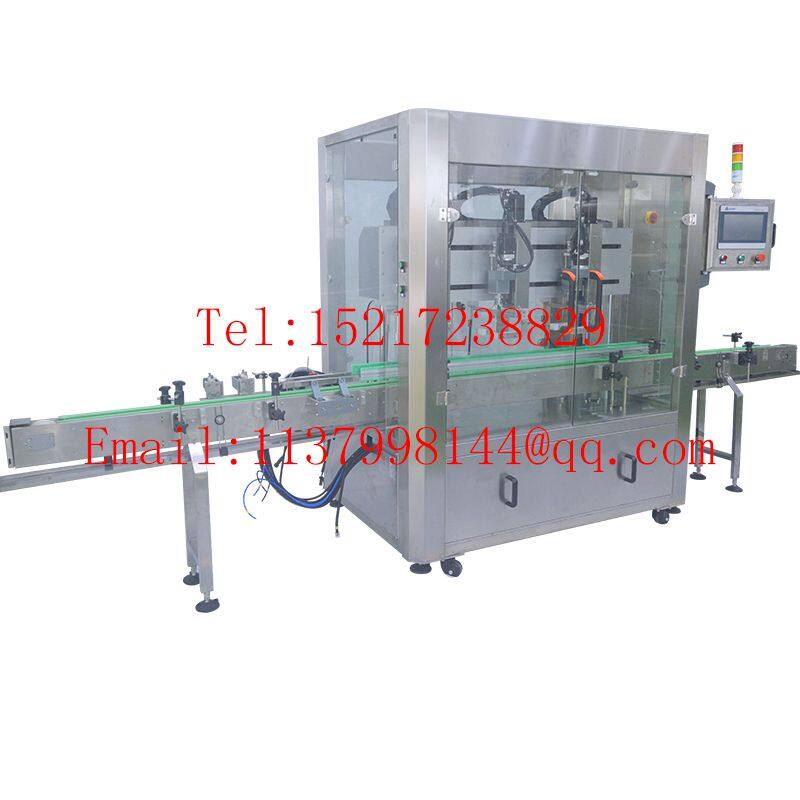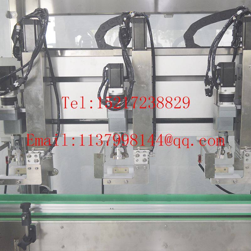 Three heads tracking type servo piston capping machine consists of chain conveyor, composed of hattle clamping automatic alignment mechanism, screw capping system,electric lift regulating mechanism, electric cap, sorting and cap feeding,waterproof electrical cabinets,touch screen human-nachine interface,etc.this machine is a key to quickly switch in bottle function,can apply to different specifications automatic multiple-function equipment of the bottle