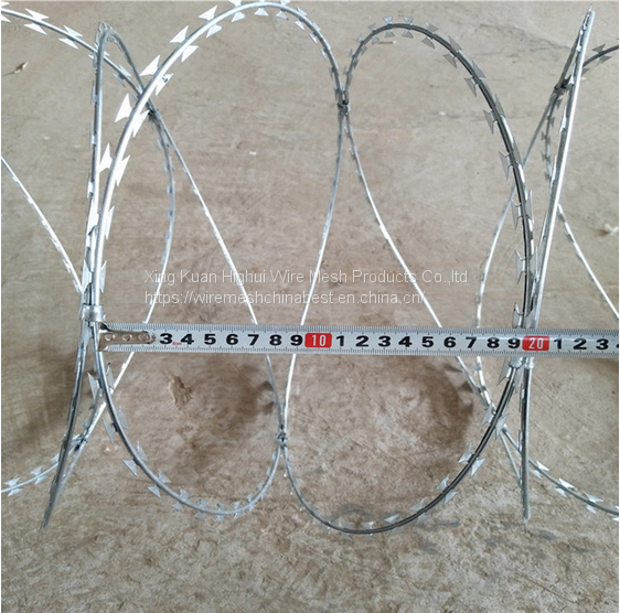 | Detailed introduction | Razor barbed wire is a kind of modern security fencing materials fabricated with razor-sharp steel blade and high-tensile wire. It can be installed to achieve the result of frightening and stopping to the aggressive perimeter intruders, with piecing and cutting razor blades mounted at the top of the wall, also the special designs making climbing and touching extremely difficult. The wire and strip are galvanized or PVC coated to prevent corrosion. Features: 1. Razor barbed is a kind of modern security fencing materials fabricated with razor-sharp steel blade and high-tensile wire. 2. Visual and psychological deterrent. 3. Resistance to corrosion. 4. Low price and easy to install. 5. It can be installed to achieve the result of frightening and stopping to the aggressive perimeter intruders, with piecing and cutting razor blades mounted at the top of the wall, its special designs making climbing and touching extremely difficult. |