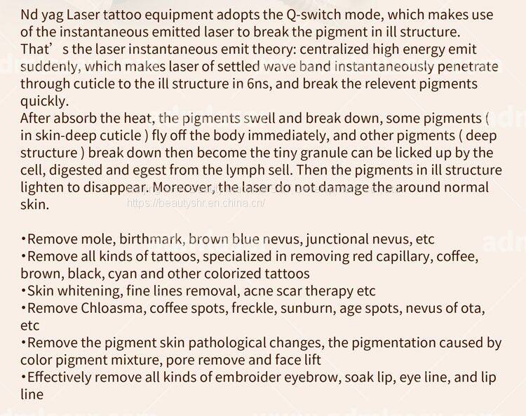 Nd yag tattoo euqipment adopts the Q-switch mode, which makes use of the instantaneous emmitted laser to break the pigment in ill structure. That's the laser instantaneous emit : centralized high energy emit suddenly, which makes laser of settled wave band instantaneous penetrate through cuticle to the ill structure in 6ns, and break the relevent pigments quickly.