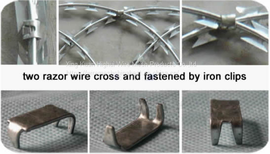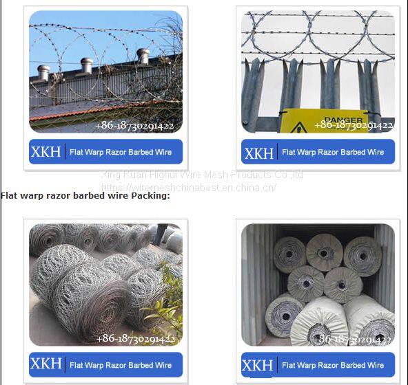 Flat warp razor wire is a new type of razor barbed wire. Press two loops into flat then expand them across. We usually use it together with been line razor barbed wire to build a defending wall, or use it alone as a fence.