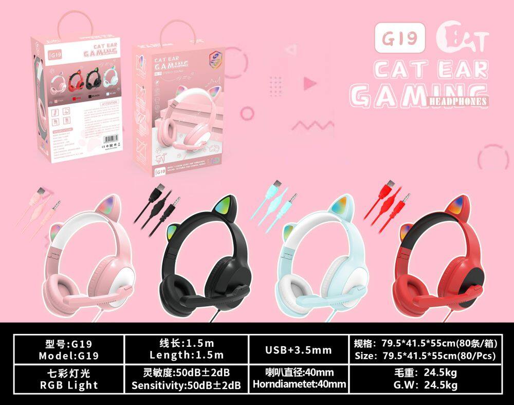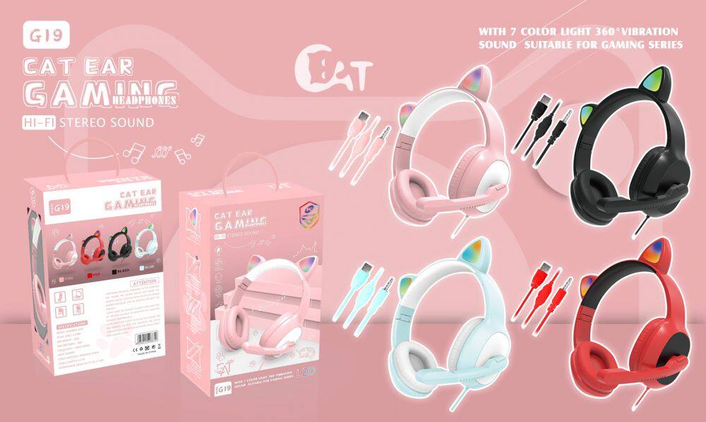 G19 Pink Cat Ear Cute Girl Gaming Headset With Mic Noise Reduction Foldable Stereo Music Helmet RGB Flash Wired Headphone