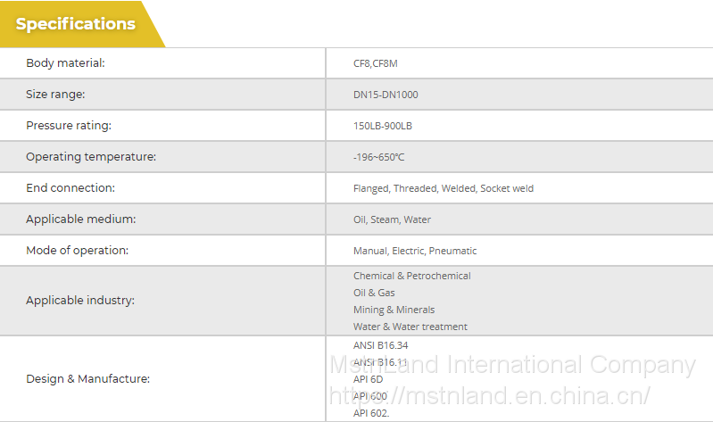 MstnLand is an international supplier and service provider of industrial valves and solutions. We integrate R&D, manufacture, resource integration and trade service into one, provide valve selection and procurement solutions for our clients with one-stop consultation and supply. Our industrial valves are widely used in petrochemical, general chemical, oil, gas, mining, refinery, power generation, general industrial, water conservancy, water treatment, paper making, marine, offshore, municipal engineering, heating, ventilation and etc.