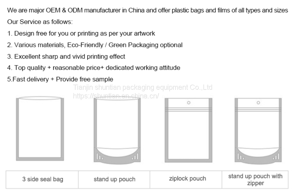 | Surface Handling | Gravure printing, plain or digital printing(accept 300pcs,500pcs bags) | ||