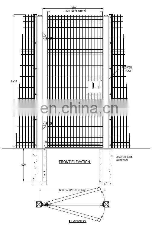 Usually when a project need go for 3D mesh fence, they will need suitable gate, basically they have options like single leaf swing gate, double leaf swing gate, singe drive or double drive cantilever slide gate, here I give you classic H 2.4 m * W 2 m 3D curved wire mesh single leaf swing fence gate system for security area, made by lower carbon steel, galvanized and power coated, panel made by classic 3D wire mesh panel, go with wire dia 4 mm, mesh size 200 mm * 50 mm, frame 60 mm * 60 mm * 1.5 mm, post would be square tube, 100 mm * 100 mm * 2 mm. gate height 2.4 m, gate width 2. m, manual swing design make it used a lot in a construction project