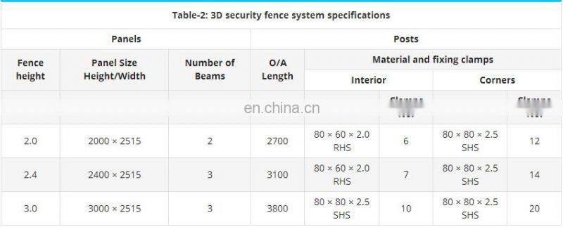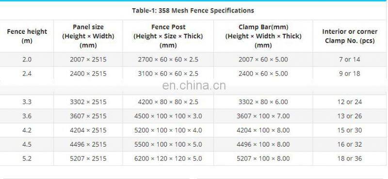 Panel width, height, finish, fence post and clamps is the same to 358 mesh fence, please see table-1.