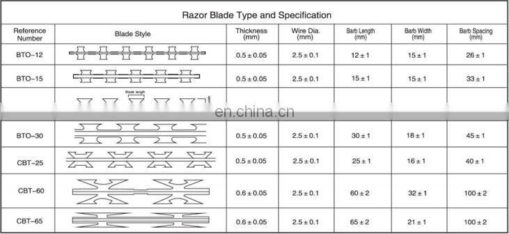 Outside Diameter | No. of Loops | Standard Length per Coil | Razor Type | Notes |