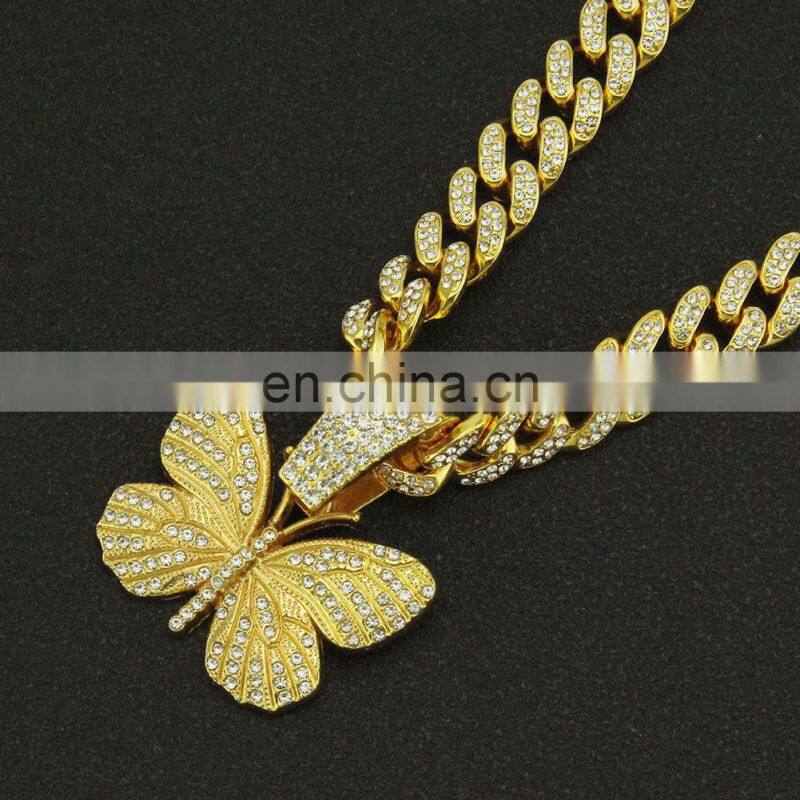 Luxury Gold Women Men Full Diamond Butterfly Pendant Necklace Crystal Cuban Link Butterfly Choker Necklace