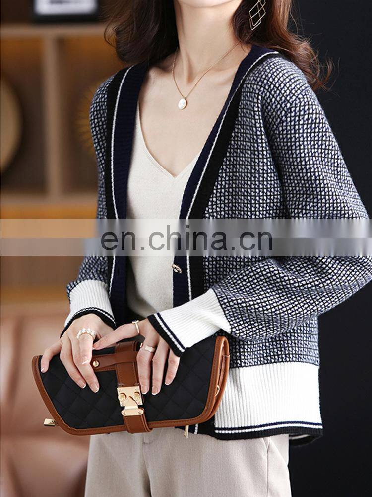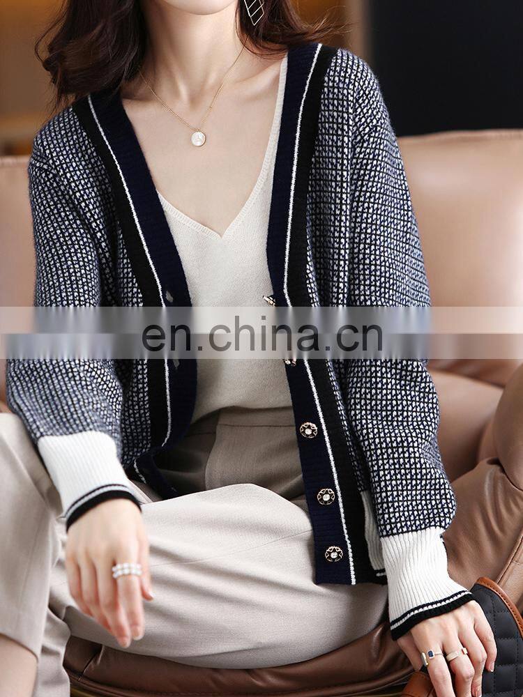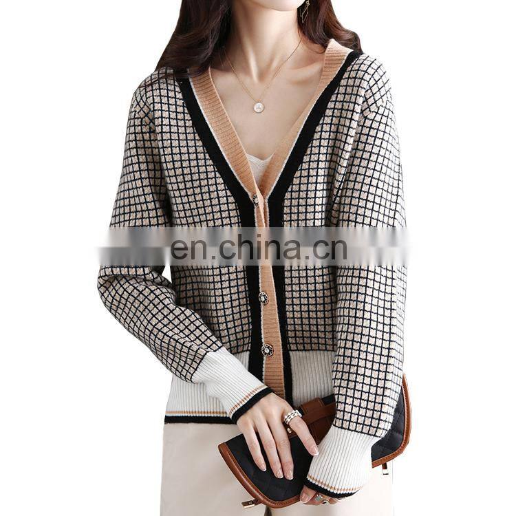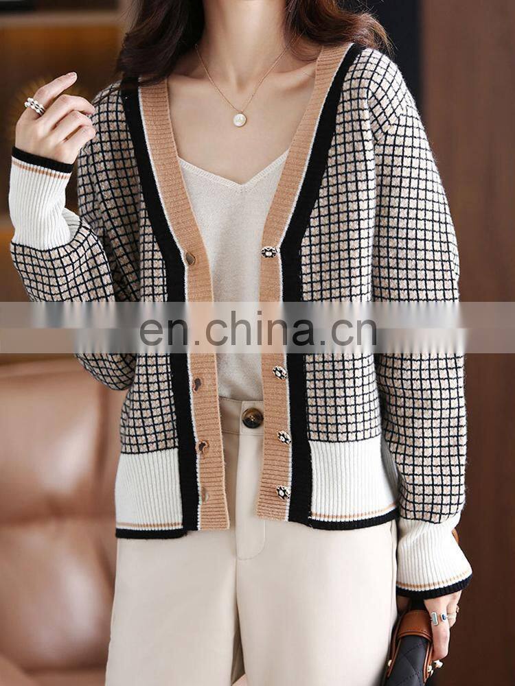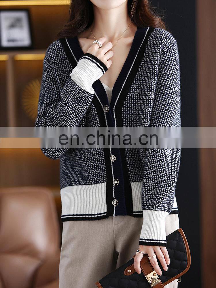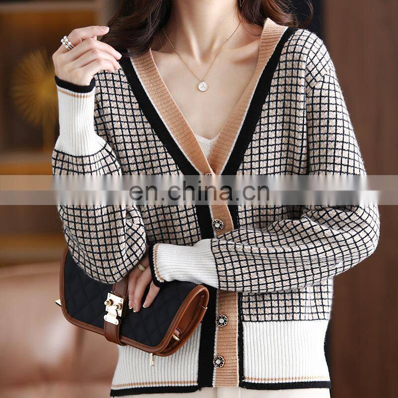 Product Name: | Women Fashion Plaid V Neck Jacquard Merino Wool Korean Style Casual Cardigan Sweater |