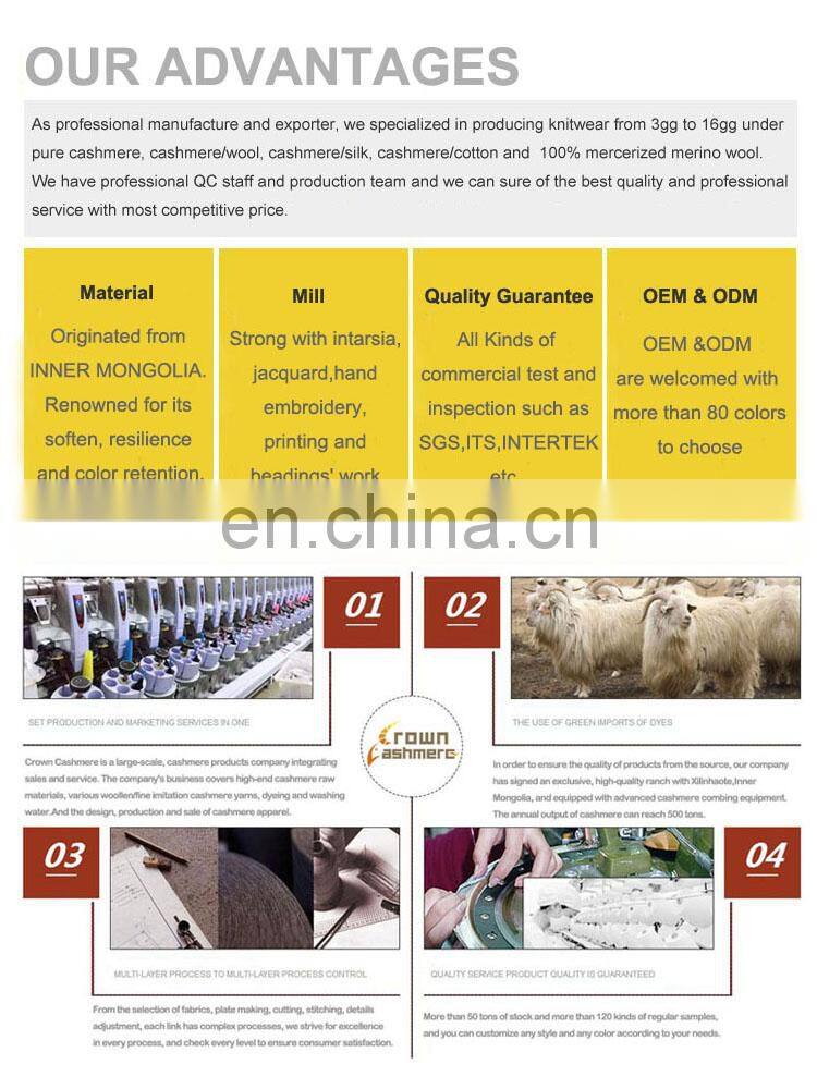 As professional manufacture and exporter, we specialized in producing kinds of ladies', men's and children's/babies' knitwear from 3gg to 16gg such as knitted pullover, cardigan, sweater, pants, glove, hat and scarf, blanket, sock, shoes under pure cashmere, cashmere/wool, cashmere/silk, cashmere/cotton, cashmere/bamboo blended yarn or 100% mercerized merino wool yarn.