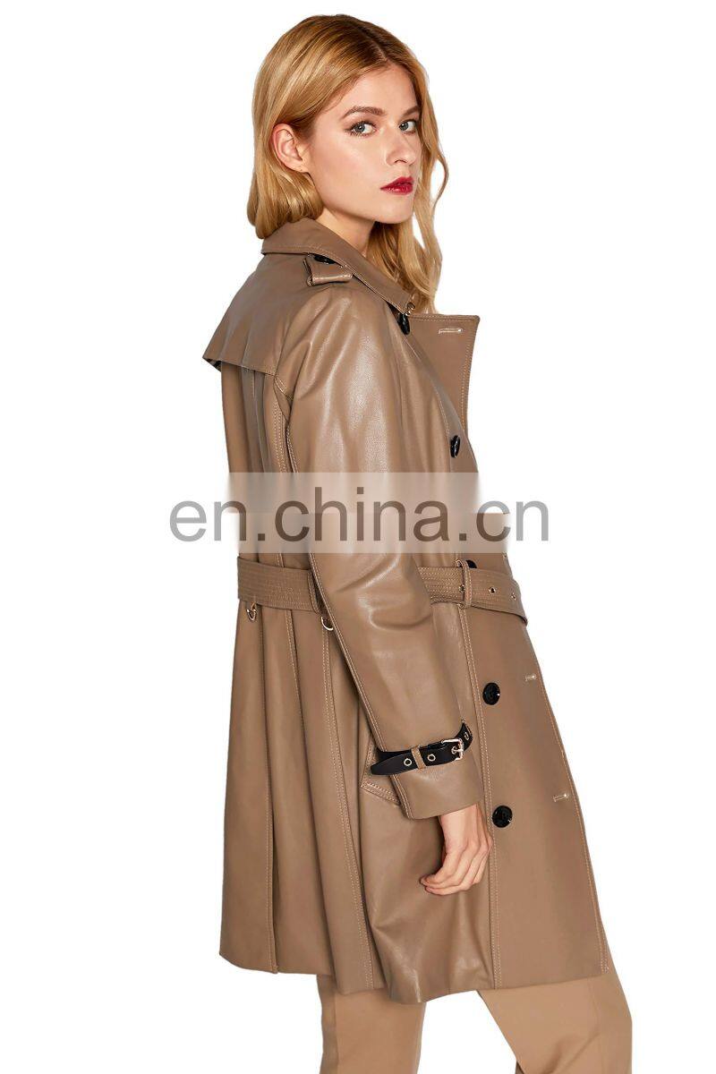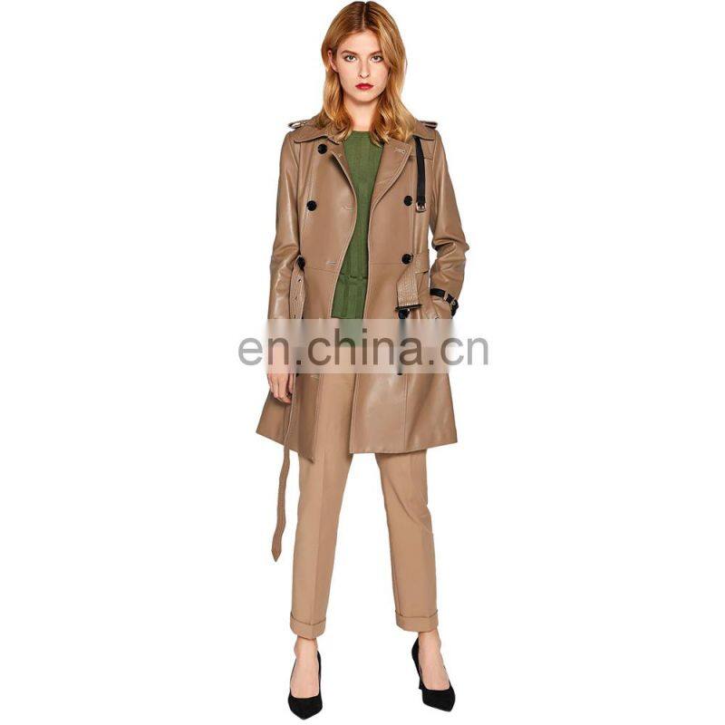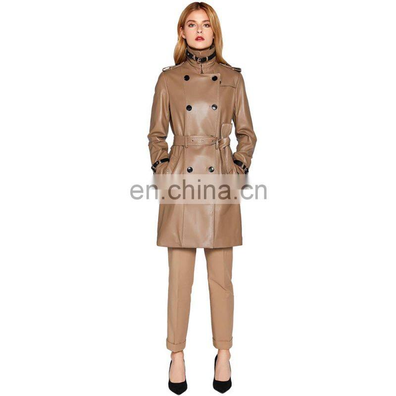 Women Lambskin Leather Double Breasted Long Jacket Coat With Belt