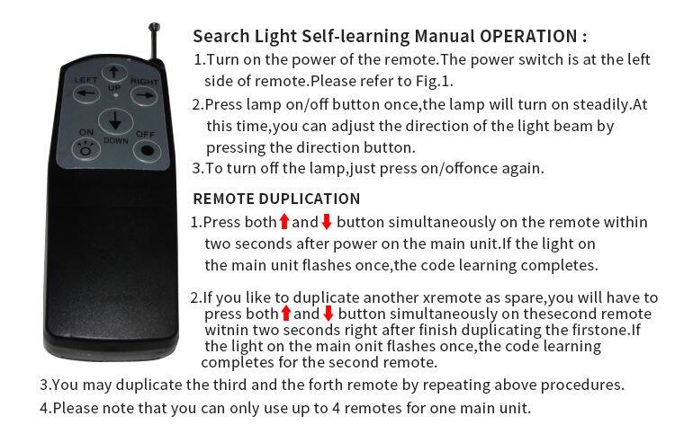 2.If you like to duplicate another xremote as spare,you will have to press both ↑and button simultaneously on the second remote witnin two seconds right after finish duplicating the first one.If the light on the main onit flashes once,the code learning completes for the second remote.