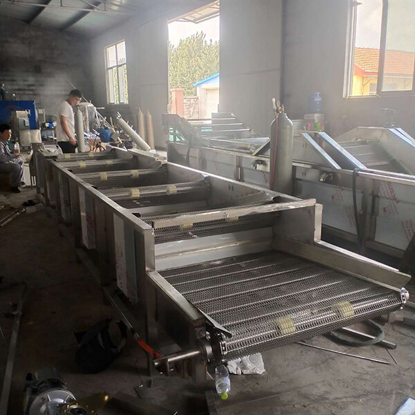 When the vegetable washing machine is working, the washing trough is filled with clean water, the motor drives the drum to make the stainless steel mesh belt work, and the blower also starts. In the washing tank, the dirt on the surface of the vegetables will be washed away due to the strong stirring action of the air sent by the blower to the water, and the movement of the stainless steel mesh belt will be followed at any time, vegetables and other materials are brought to the stainless steel mesh belt inclined section, by spray Tube Zui after a cleaning. Then into the upper horizontal section repair inspection after the next process.