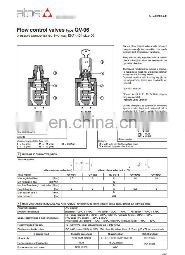 ATOS QV-06/1/6/11/16/24 hydraulic flow control valves QV-06/1 60