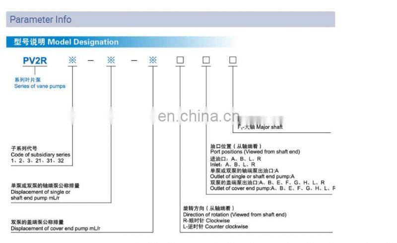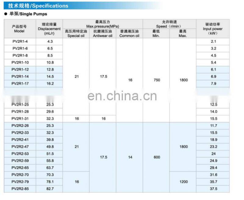 PV2R series of vane pumps with high pressure and lower noise are high-performance products, which are developed and domestically produced by our company, featured by advanced performance, reasonable structure, good creditability, lower noise,ultra-low pulse and stable quality and so on. Precisely made, the product can be used in the equipment with high precision and low noise, and is widely used in cutting, plastic, leather, forging and engineering machinery fields, and the like.