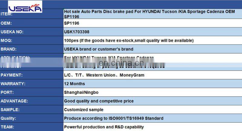 Hot sale Auto Parts Disc brake pad For HYUNDAI Tucson /KIA Sportage Cadenza OEM SP1196