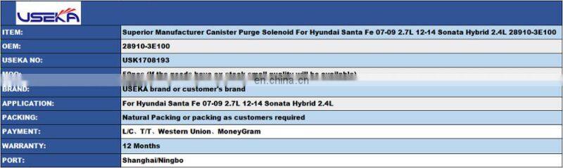 Home > Products > For Hyundai parts > Superior Manufacturer Canister Purge Solenoid For Hyundai Santa Fe 07-09 2.7L 12-14 Sonata Hybrid 2.4L 28910-3E100