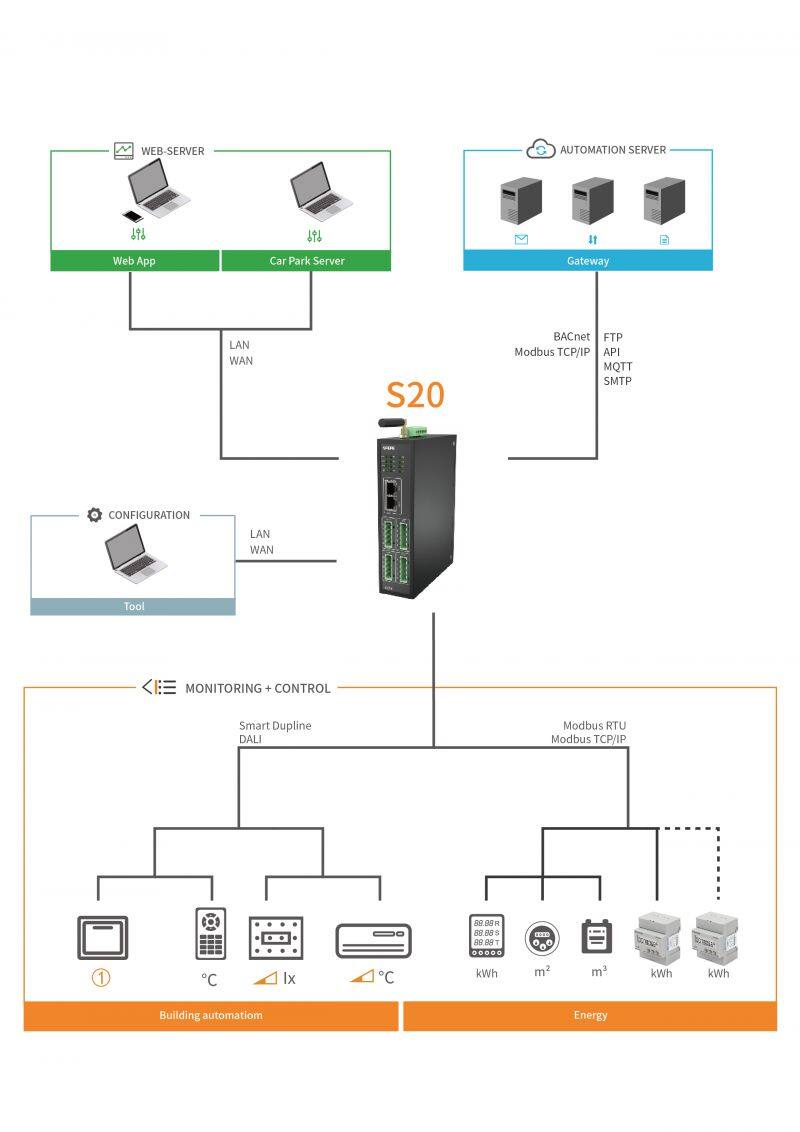 S20 is suitable for applications in Building Automation, Energy Efficiency Performance Management, Car Parking Guidance and all their combinations are suitable application for S20 software. Its comprehensive set of functions, small dimensions and reliability are the key factors for depending on S20 as the local monitoring/controlling unit in a wider distributed scenario.