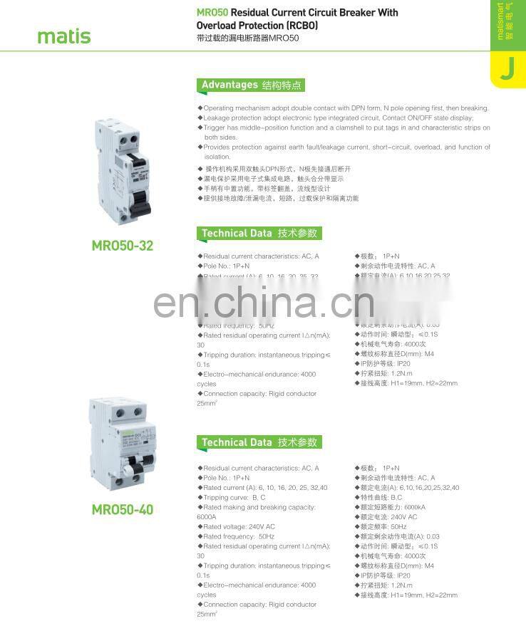 Latest Technology MRO50-1P 240V 50HZ Residual Current Circuit Breaker With Overload Protection RCBO