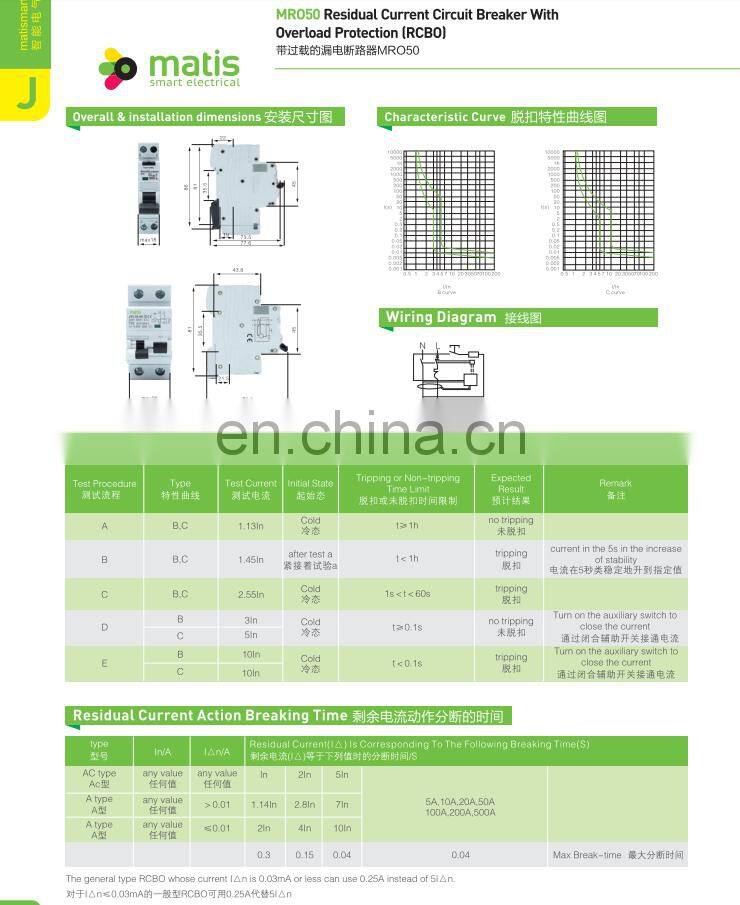Wholesale RCBO MRO50-1P 240V 50HZ Residual Current Circuit Breaker With Overload Protection