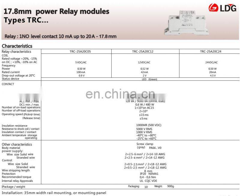 TRC-25A20C24 High Power Din Rail Relay 24VDC/AC 20mA Input 250VAC 20A Output Soft Starting Electromagnetic Contact Relay Module