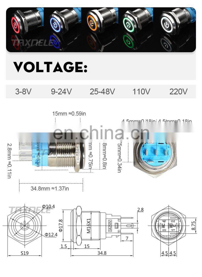 16mm Waterproof Metal Push Button Switch Ring and LED Light 9-24V 12V 110V 220V Momentary Latching 1NO 1NC Wide Voltage
