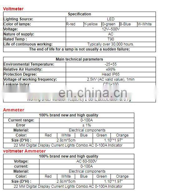 22MM Meter Digital Display Round Square Dual Voltmeter Ammeter Current Voltage 100a Ammeter LED Signal Light