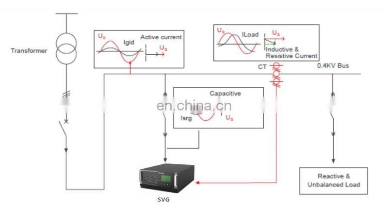 The principle of the SVG is very similar to that of Active Power Filter, as demonstrated in the picture below. When the load is generating inductive or capacitive current, it makes load current lagging or leading the voltage. SVG detects the phase angle difference and generates leading or lagging current into the grid, making the phase angle of current almost the same as that of voltage on the transformer side, which means fundamental power factor is unit. SFR-SVG is also capable of correcting load imbalance.