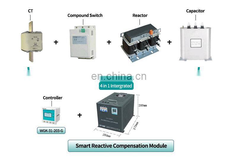 The components of dynamic harmonic suppression reactive compensation module include DSP digital processing circuit, highly integrated detection, control, protection, display unit, zero crossing switching module, discharge and air cooling unit, filter reactor, low-voltage filter power capacitor and function module operation status indicator circuit. This module is a new generation of dynamic reactive compensation equipment for 0.4kV low voltage ditribution network which is suitable for frequent load change and high voltage qualification rate requirement situation.It is a typical dynamic traking compensation integration module with switching time ≤20ms.