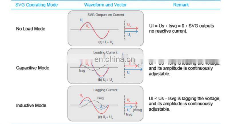 The principle of the SVG is very similar to that of Active Power Filter, as demonstrated in the picture below. When the load is generating inductive or capacitive current, it makes load current lagging or leading the voltage. SVG detects the phase angle difference and generates leading or lagging current into the grid, making the phase angle of current almost the same as that of voltage on the transformer side, which means fundamental power factor is unit. SFR-SVG is also capable of correcting load imbalance.SVG Running Mode
