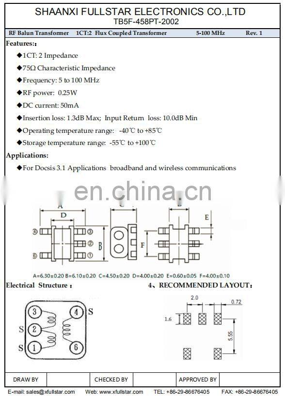 Home > Products > Electrical transformer > RF Flux Coupled Balun Transformer 75ohm 5 to 100 MHz 0.25W For VHF/UHF Receivers/transmitters.