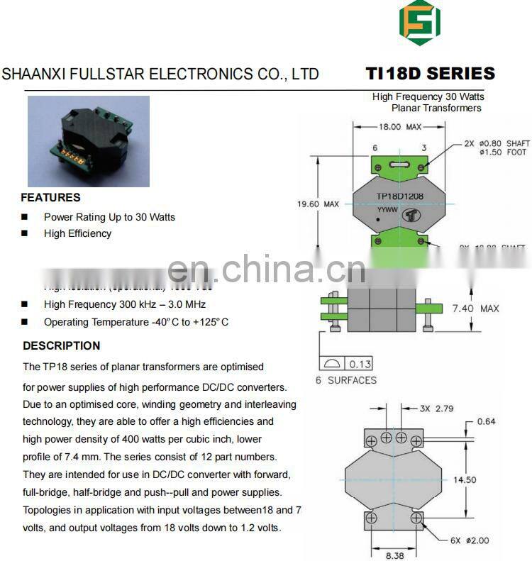The TP18 series of planar transformers are optimised for power supplies of high performance DC/DC converters.
