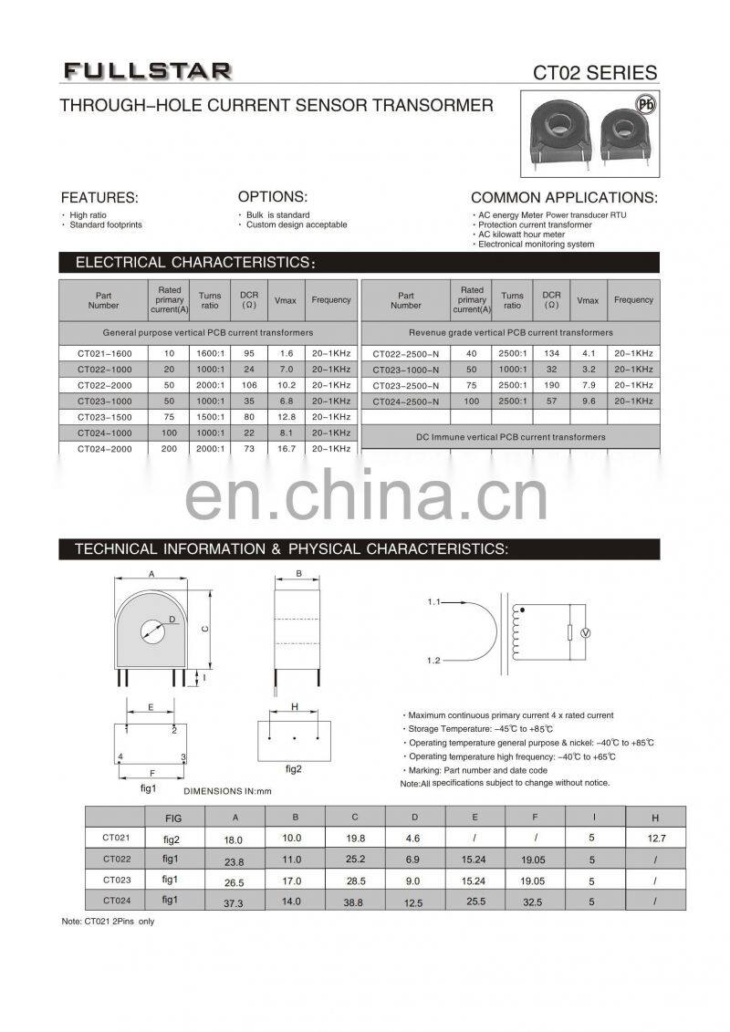 Product features | 1.Low profile, compact size, Epoxy resin encapsulated, fully enclosed. 2. PCB mounting type, easy to fix and install. 3.wide linearity range for output current and low phase shift error. 4.Customer specifications are available. 5. Used in universal and be in good interchangeability. | ||||